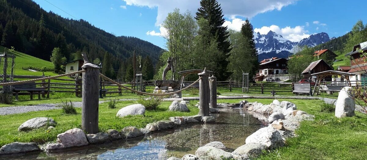 Nur etwa 10 Gehminuten von unserem Aparthotel entfernt erwartet Sie die Kneippanlage in Filzmoos – ein besonderer Kraftplatz am Fuße der imposanten Bischofsmütze. Eingebettet in die idyllische Natur der Region verbindet dieser Ort Erholung, Gesundheit und Naturerlebnis auf einzigartige Weise.
