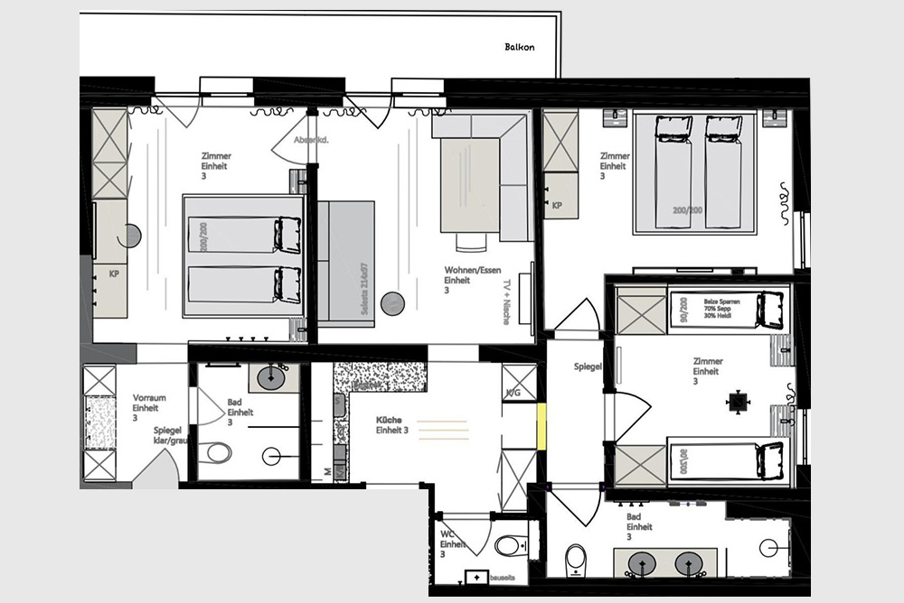 Optionale Erweiterung: Für größere Gruppen oder Familien bieten wir die Möglichkeit, ein zusätzliches Schlafzimmer mit 2x2 m Boxspringbett und eigenem Bad (inkl. WC) hinzuzubuchen. So können Sie Ihr Appartement flexibel für bis zu 7 Personen erweitern und den Komfort eines weiteren Badezimmers genießen.